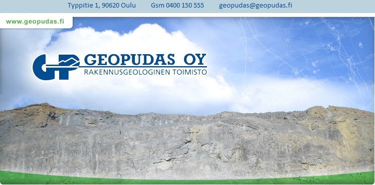 Geopudas Oy Geopudas Oy on vuonna 1987 perustettu rakennusgeologinen toimisto, jonka päätoimialana ovat maa- ja kiviainesten rakennustekniseen käyttöön ja ottotoimintaan liittyvät tutkimukset ja suunnitelmien laatiminen. Toiminta-alueemme on koko Suomi, keskittyen kuitenkin Pohjois-Suomeen.